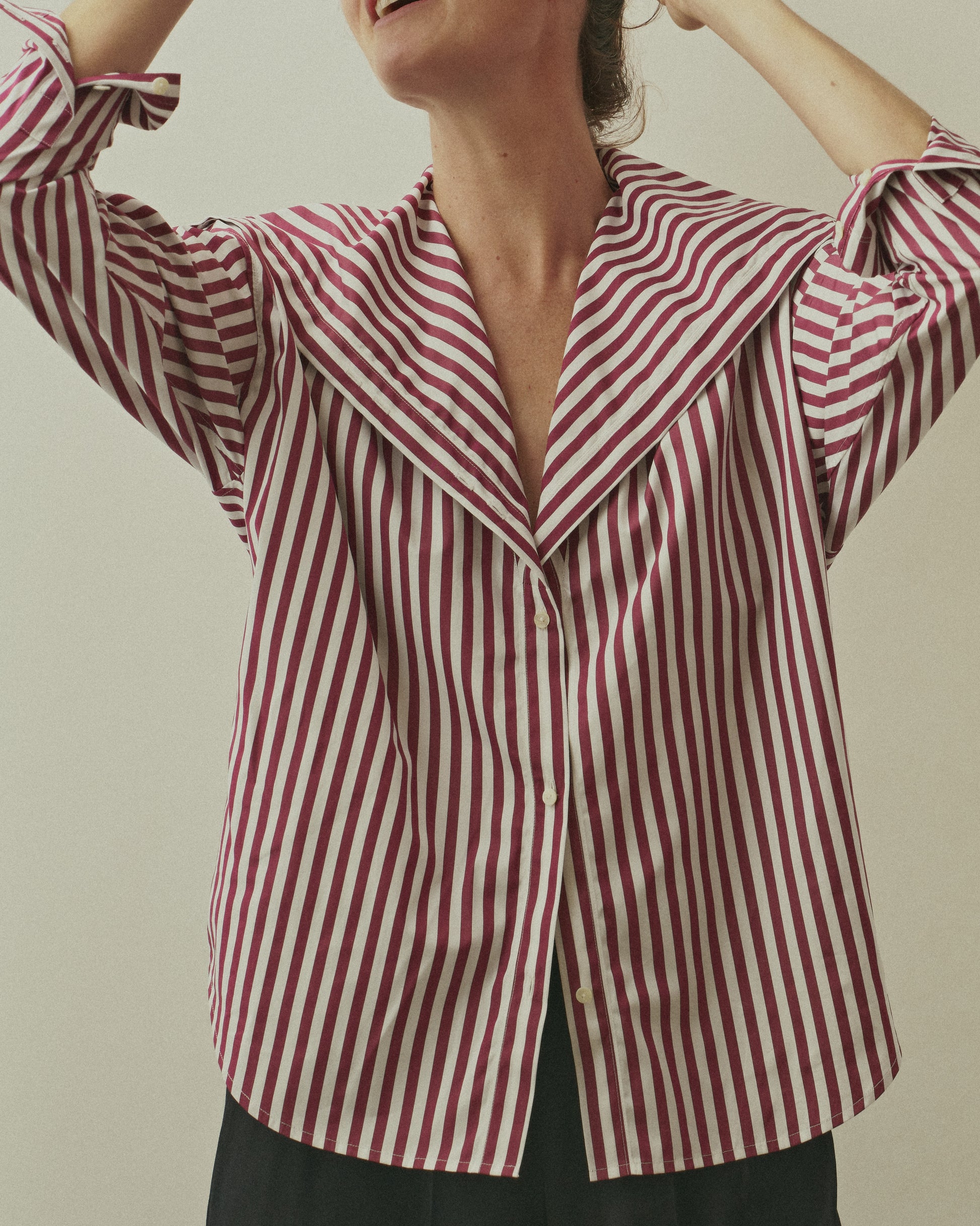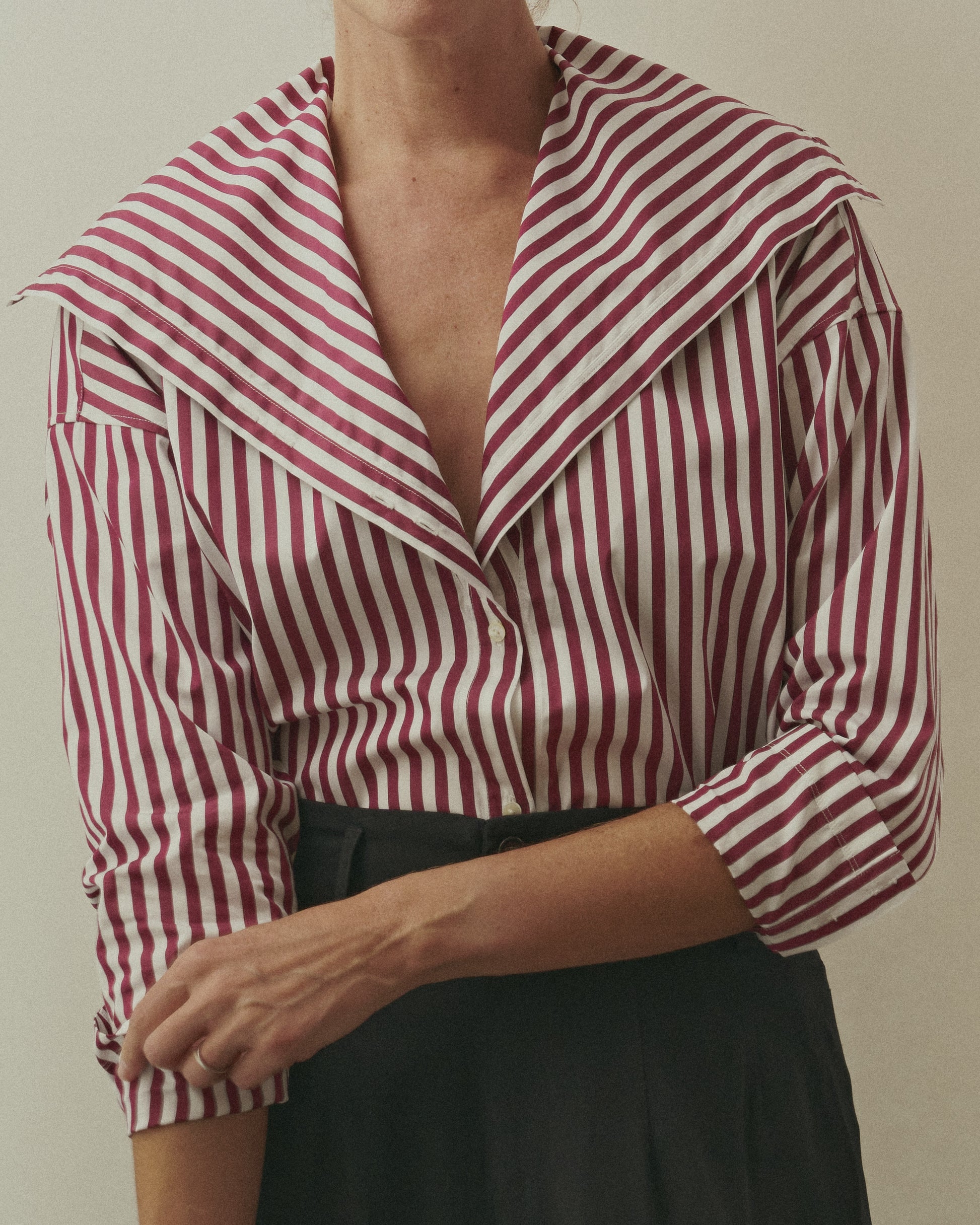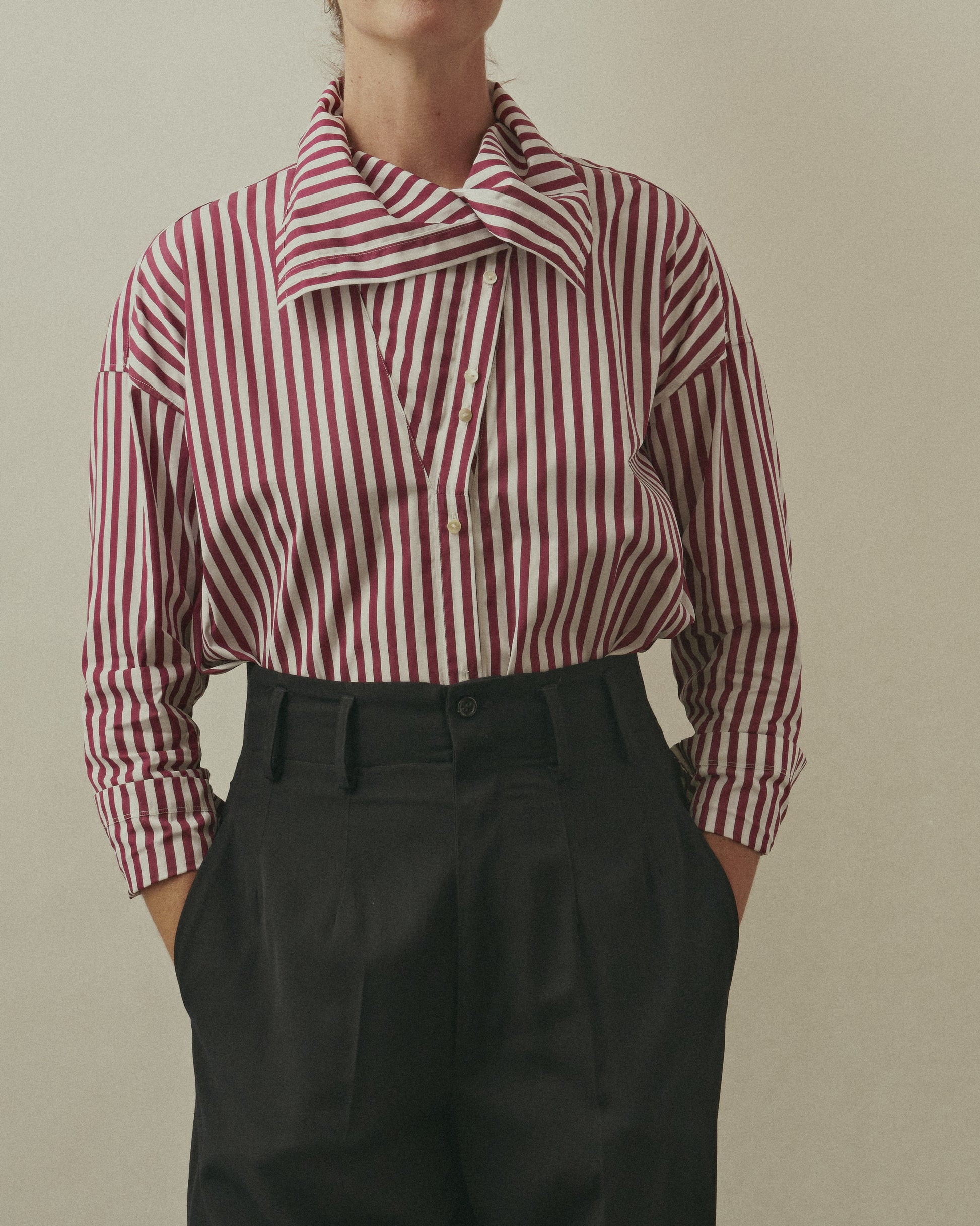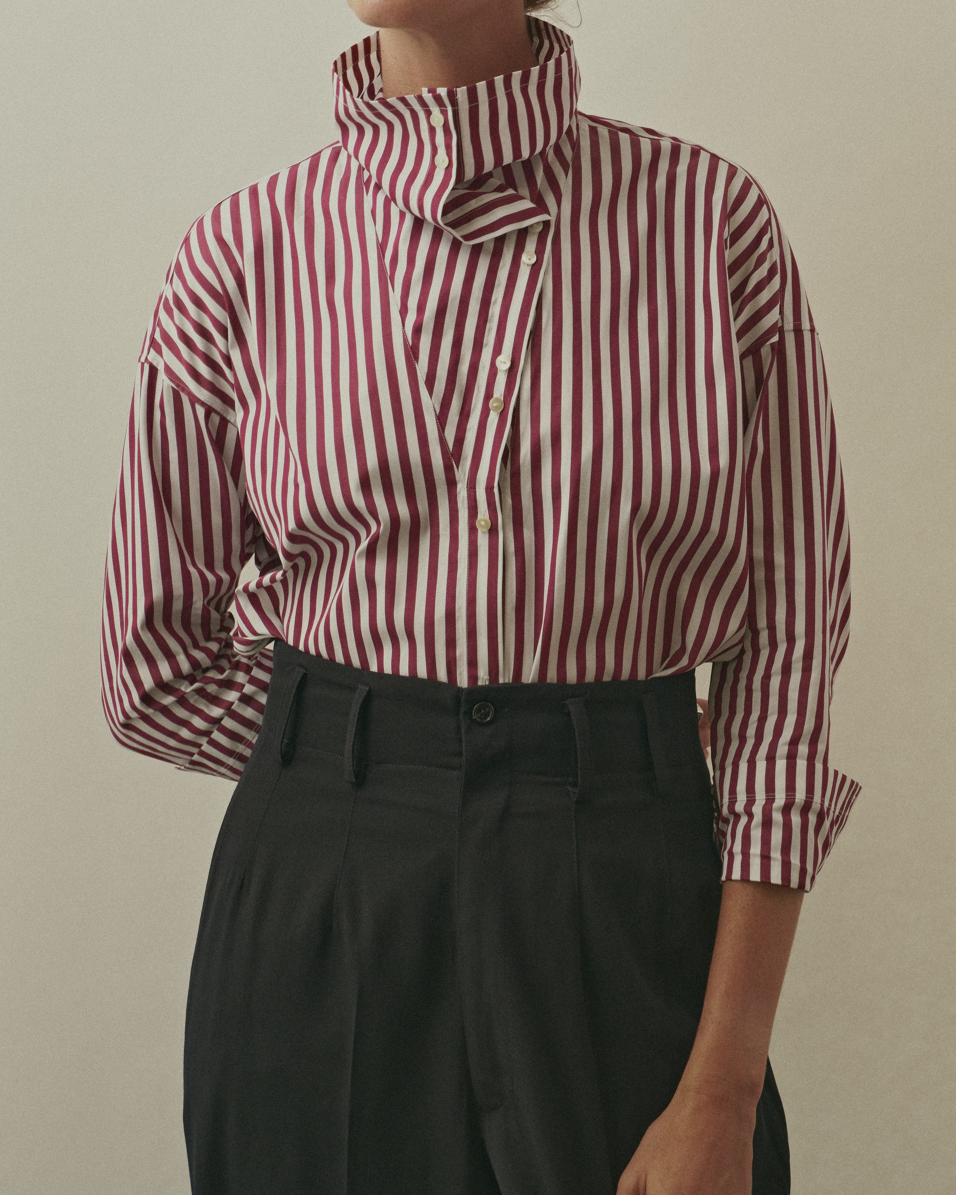 A stately and versatile E.M. Reitz blouse. This bold and proud collar transforms from a high-buttoned, drapey cowl neck to a low-slinging V-neck with a dramatic sailor collar. The unique shape of the collar is punctuated with a double-button detail. As you unbutton each button, you can create a distinctive scarf-like composition. This shirt can be as modest or as sexy as you like.
