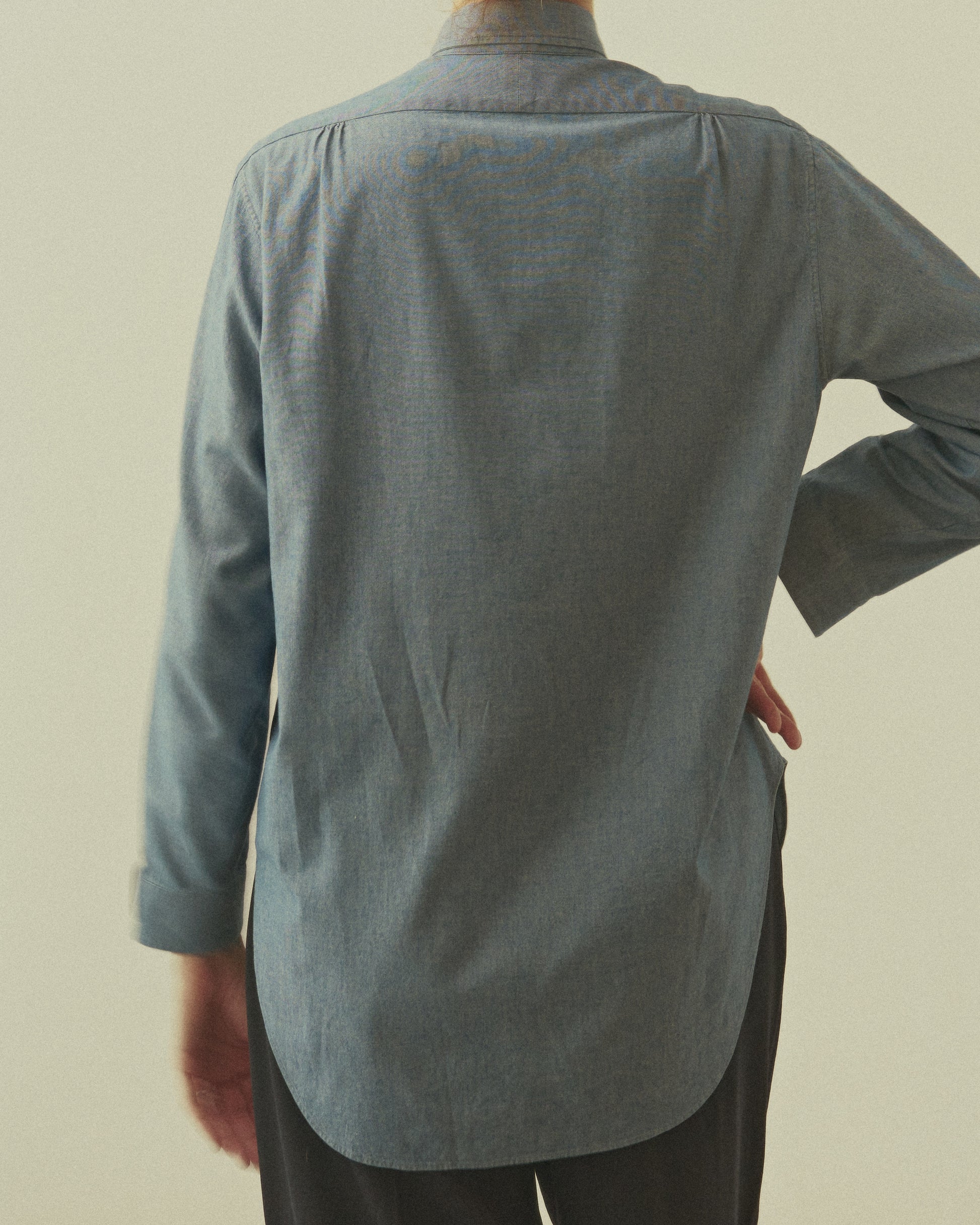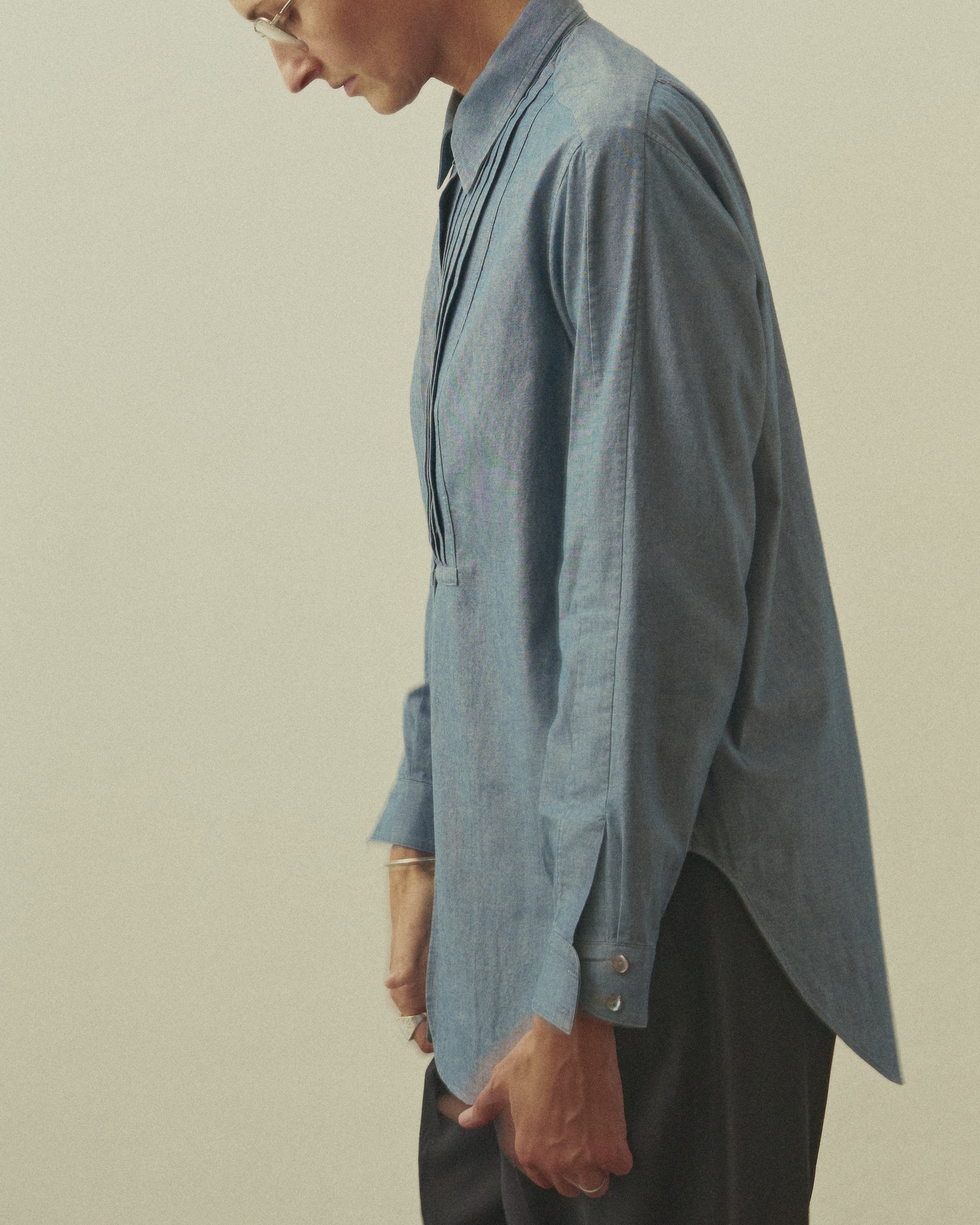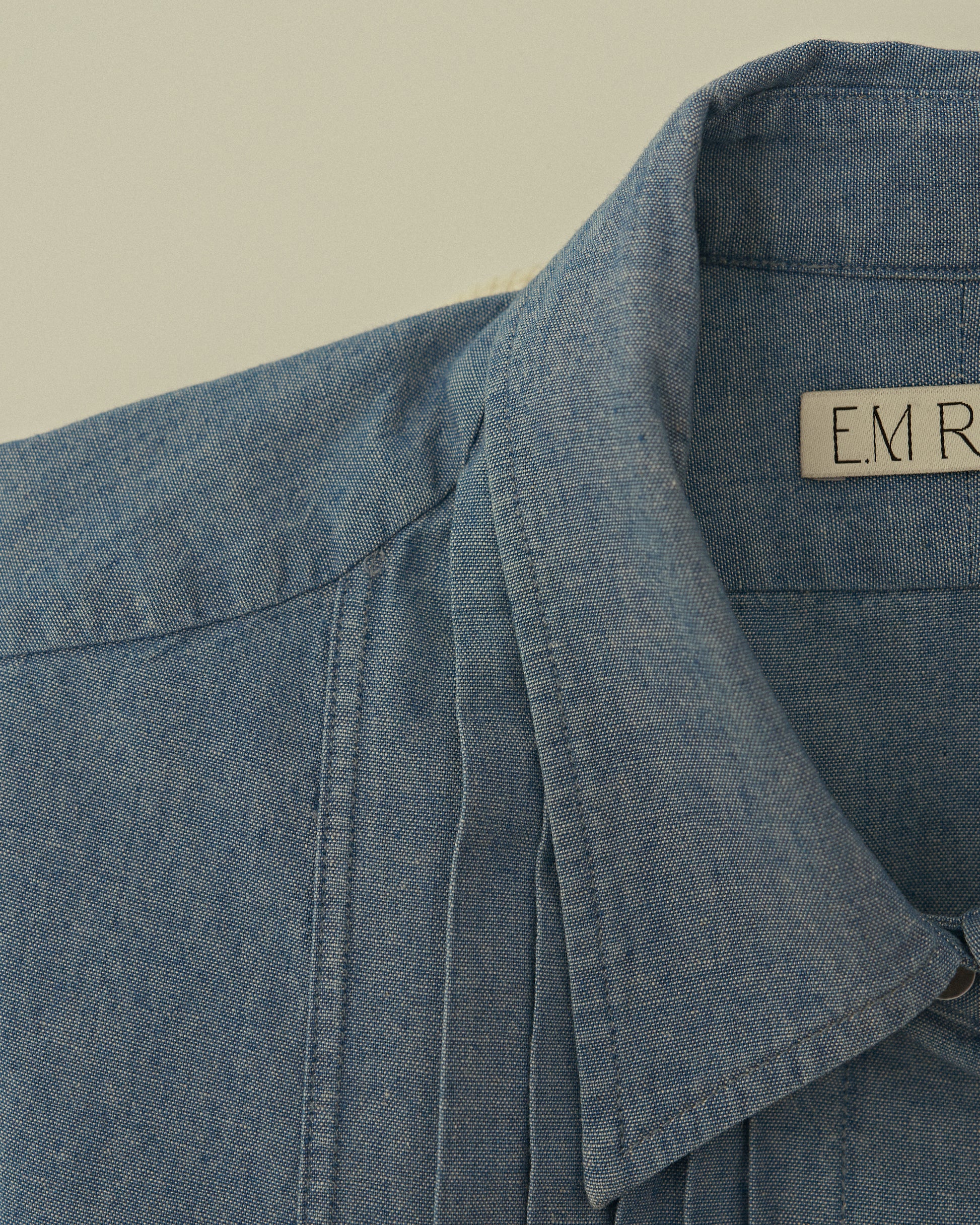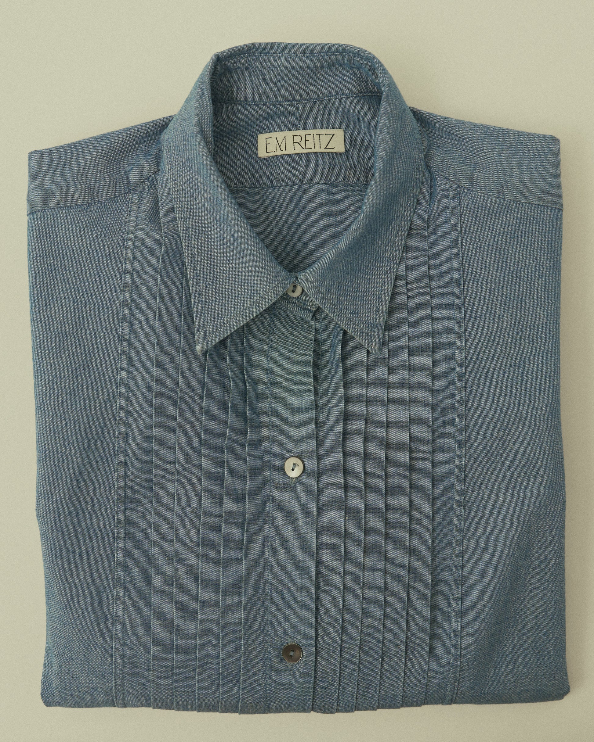 Mirador is a tux-inspired E.M.Reitz shirt. The silhouette sings with a bounty of details, including a tucked bib and a saddle shoulder panel that extends from the neck to the beautifully constructed, rounded cuff.