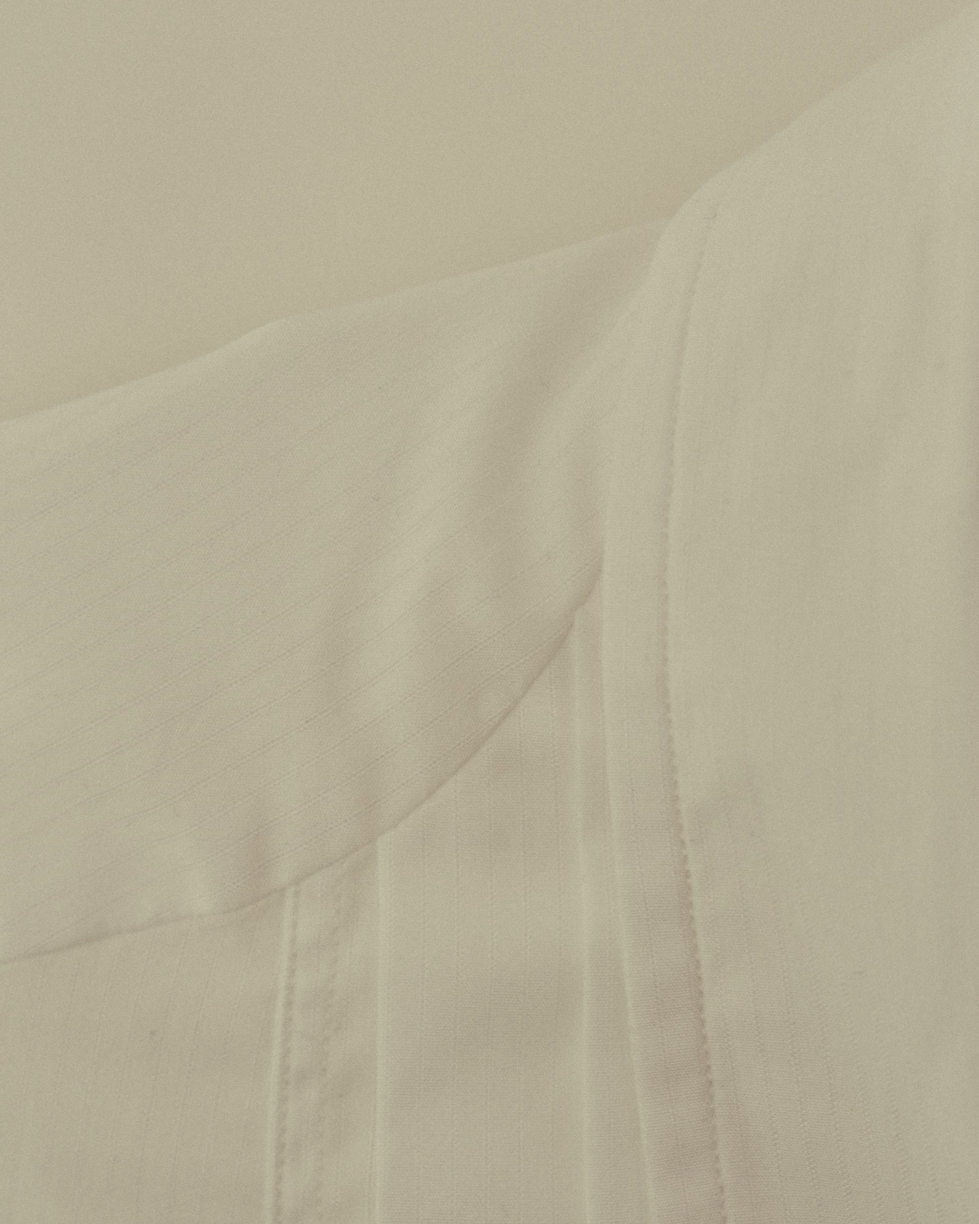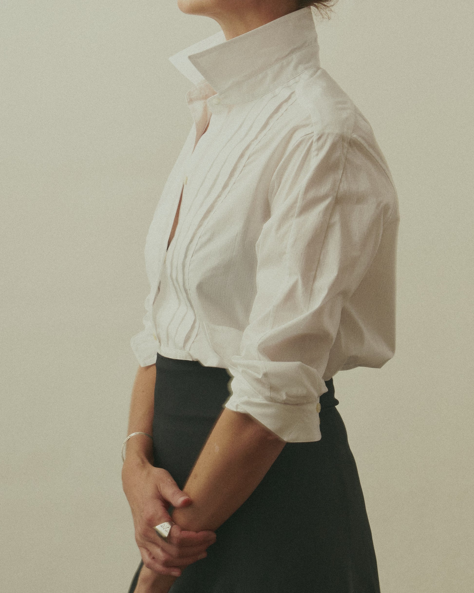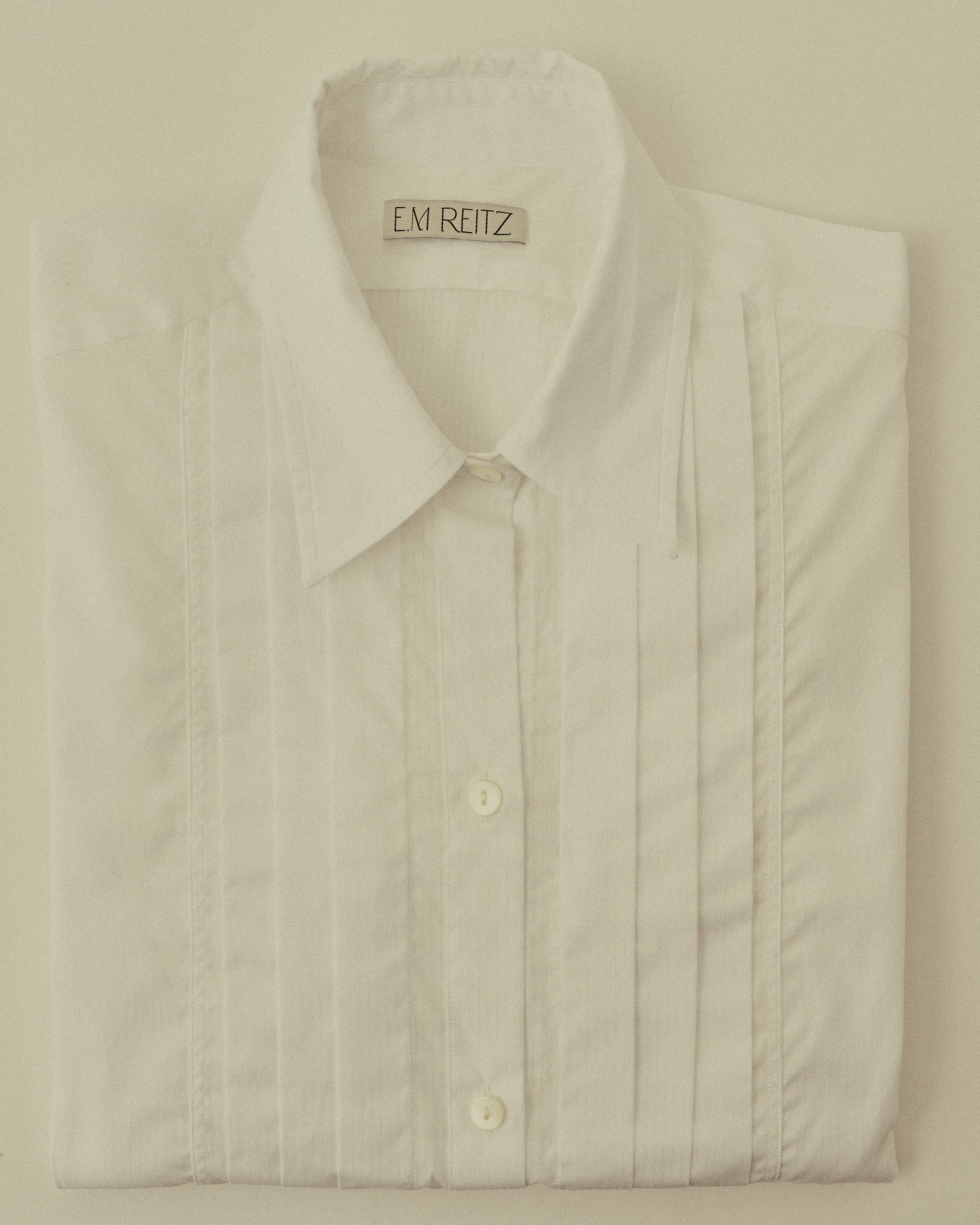 Mirador is a tux-inspired E.M.Reitz shirt. The silhouette sings with a bounty of details, including a tucked bib and a saddle shoulder panel that extends from the neck to the beautifully constructed, rounded cuff.
