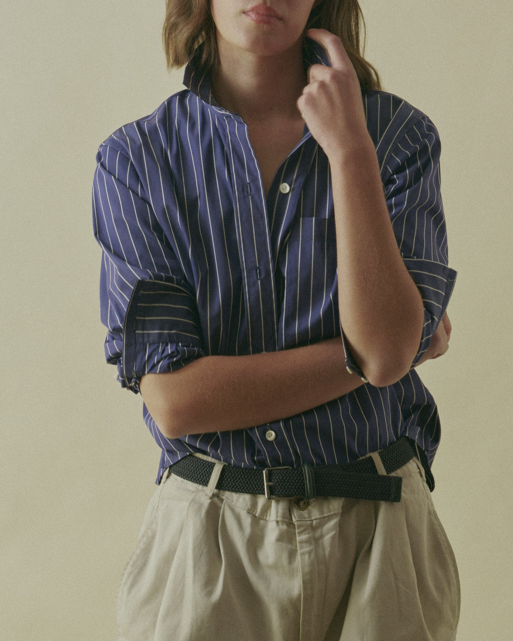 The Boss Dog is our most classic shirting design, inspired by great menswear dress shirts, but seen through the lens of E.M. Reitz. It is a versatile shirt, classic in shape, modern in detail. On body, it offers a confident and powerful silhouette - every position is a power pose. She makes you feel at ease, enlarges your presence, evokes confidence, and brings you joy. This is a shirt that is straightforward but mighty - one might call it “the perfect shirt.” It is equally at home tucked into a great pair of trousers, or worn flowing free and oversized.